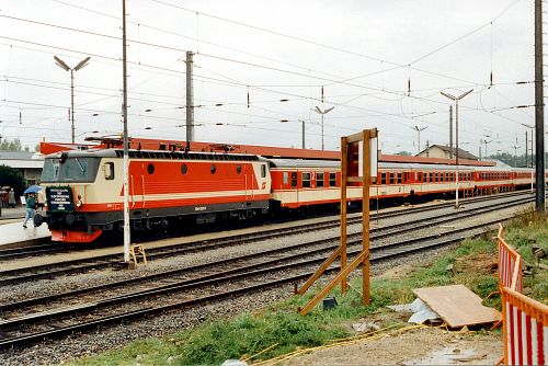 Auf dem Bild findet sich der D 270-Vindobona, bestehend aus einer zehnteiligen Reisezugwagen-Garnitur bei der Ausfahrt von Bhf. Ceske Velenice Richtung Prag-Berlin am 9.5.1992 - einen Monat vor der Verlagerung von der Franz-Josefs-Bahn auf die Nordbahn.